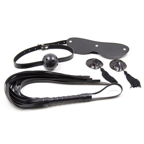 סט למשחקי שליטה בצבע שחור המכיל כיסוי פטמות, שוט, כיסוי עיניים וגאג