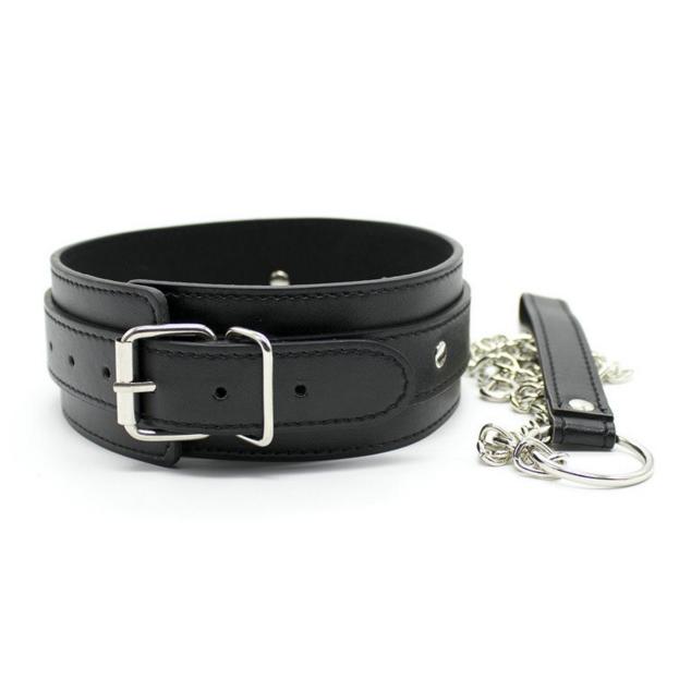 קולר שחור ומעוצב שעשוי מעור איכותי ומכיל רצועה,