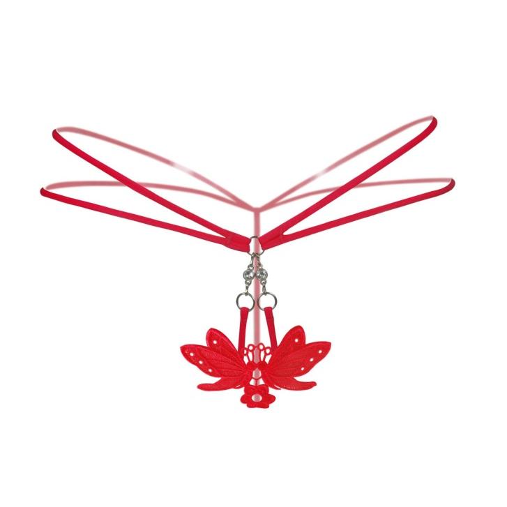 אוהבת אופנה מינימליסטית? טוב מאד, כי אין יותר מינימליסטי מהחוטיני השובב הזה. שתי רצועות עדינות בצידי האגן, חוט אחד חצוף בישבן – כולם מובילים באמצעות טבעות מתכת כסופות אל הפרפר המעודן שמכסה בדיוק את האיזור הכי אסטרטגי בגוף האישה. אבל לא מכסה עד הסוף, אפשר קצת להציץ.
