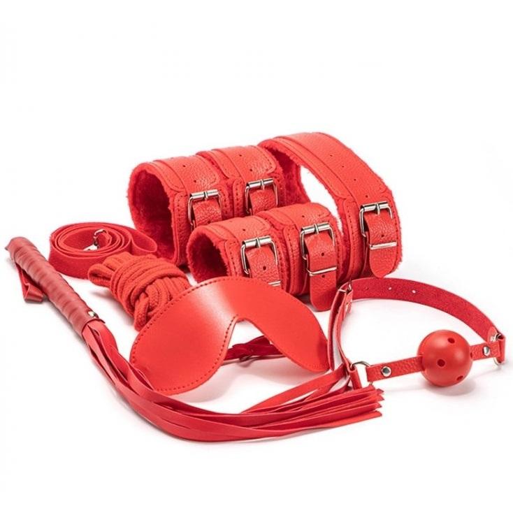 הסט מגיע עם כל מה שאת צריכה להתחיל משחקים שובבים בבית: גאג מלטף ונוח, אזיקי ידיים ורגליים מרופדים שלא שורטים, כיסוי עיניים לעקצוץ של מסתורין, קולר ורצועה לשליטה הדדית פלרטטנית, חבל רך לקשירות יצירתיות, ושוט שמנגן על העורקים של הציפייה. הכול באדום חושני, עור עם גימור פרוותי שמרגיש כמו חיבוק שמזמין להשתחרר.